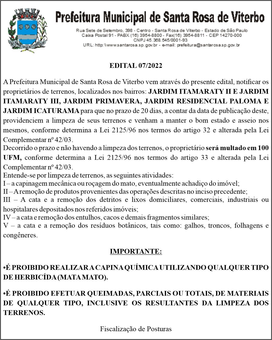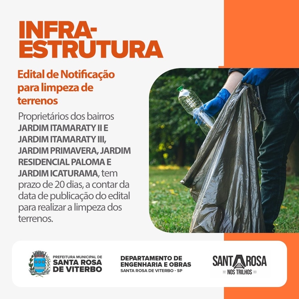 Ficam notificados os proprietários de terrenos localizados nos bairros: JARDIM ITAMARATY II E JARDIM ITAMARATY III, JARDIM PRIMAVERA, JARDIM RESIDENCIAL PALOMA E JARDIM ICATURAMA para que, no prazo de 20 dias, a contar da data de publicação deste, providenciem a limpeza de seus terrenos e venham a manter o bom estado e asseio nos mesmos, conforme determina a Lei 2125/96 nos termos do artigo 32 e alterada pela Lei Complementar nº 42/03.