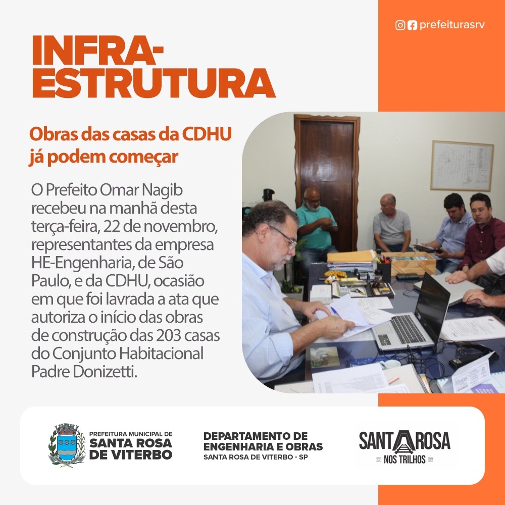 O Prefeito Omar Nagib recebeu na manhã desta terça-feira, 22 de novembro, representantes da empresa HE-Engenharia, de São Paulo, e da CDHU (Companhia de Desenvolvimento Habitacional e Urbano), ocasião em que foi lavrada a ata que autoriza o início das obras de construção das 203 casas do Conjunto Habitacional Padre Donizetti.