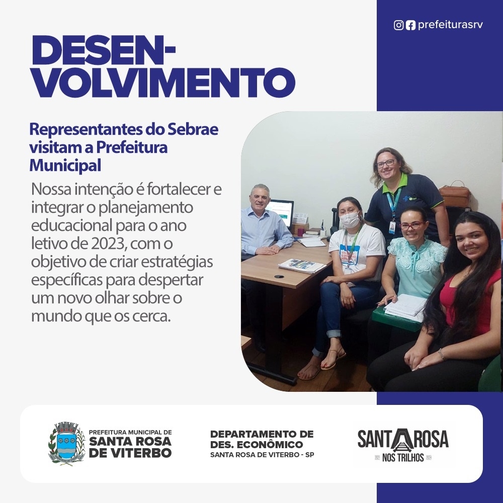 A Prefeitura Municipal de Santa Rosa de Viterbo, representada pelos Diretores Arnaldo Cersossimo (Desenvolvimento), Marcos Ferri (Educação) e pela Professora/Coordenadora de Educação Ambiental, Vilma Andresa Ribeiro Chiquito Breda, tiveram a honra de receber na manhã desta terça-feira, 22, os representantes do SEBRAE: Carlos Alberto Freitas, Elisângela Doroteu, Carolina Leal de Moraes e Patrícia Fernandes do Prado Basso.