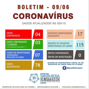 Nesta terça-feira, o Departamento de Saúde e a Equipe de Vigilância Epidemiológica de Santa Rosa de Viterbo registraram novo caso de paciente que testou positivo para o novo coronavírus, em exame laboratorial.