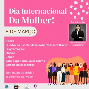 O tradicional evento, realizado no dia 08 de março, em homenagem ao Dia Internacional da Mulher, acontecerá às 19h30 na quadra da escola José Roberto Costa Bruno, no Jardim Aquárius. A programação contará com bate papo sobre autoestima com a psicóloga Jéssica M. Rodrigues, show musical com a cantora Sueli e o músico Raul Marostegan, show de dança com o grupo da Naty dance e sorteios de presentes para as mulheres.