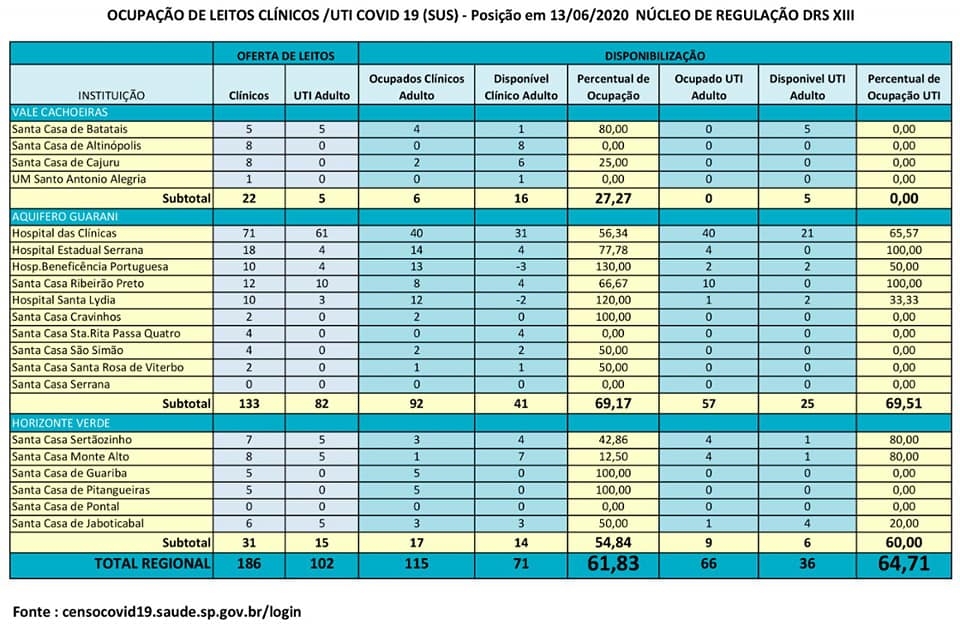 Atualização de casos e óbitos COVID-19 dos Municípios de abrangência do DRS XIII em 13/06/2020, dados compilados pelo GVE de acordo com resultados laboratoriais e fornecidos pelas Vigilâncias Epidemiológicas Municipais. Como os dados são compilados até às 11:00, podem haver divergências: