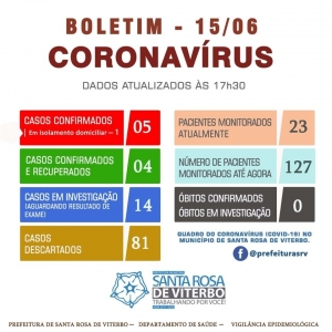 ❌ O número de pacientes que testaram positivo para o coronavírus em Santa Rosa de Viterbo é de 5 casos. Desse total, 4 pacientes já encontram-se recuperados e apenas 1 segue em isolamento domiciliar, monitorado pelo Departamento de Saúde e Setor de Vigilância Epidemiológica.