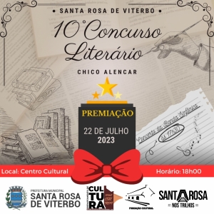 Acontece no sábado, dia 22 de julho, no Centro Cultural, a partir das 18h00, a cerimônia de Premiação da 10ª Edição do Concurso Literário Chico Alencar. No total, foram 162 redações recebidas pela organização e analisadas pelos jurados (as) Neuza Vital Passoni, Julio Pironi e Luciana Batista Furtado.