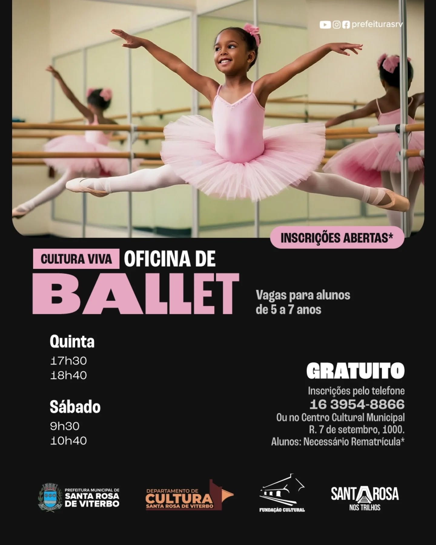 O Departamento de Cultura da Prefeitura de Santa Rosa de Viterbo anuncia a abertura das inscrições para as oficinas culturais oferecidas no município. As vagas estão disponíveis para as modalidades de ballet, desenho, dança e teatro, e são uma excelente oportunidade para quem deseja desenvolver habilidades artísticas e culturais.