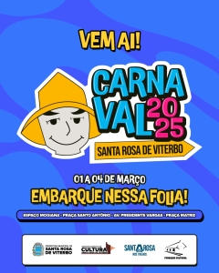 Prepare sua fantasia, reúna a família e os amigos e venha aproveitar o melhor do Carnaval 2025 em Santa Rosa de Viterbo. Fique de olho nas redes sociais da Prefeitura para mais informações. Em breve, mais detalhes sobre a programação serão divulgados!