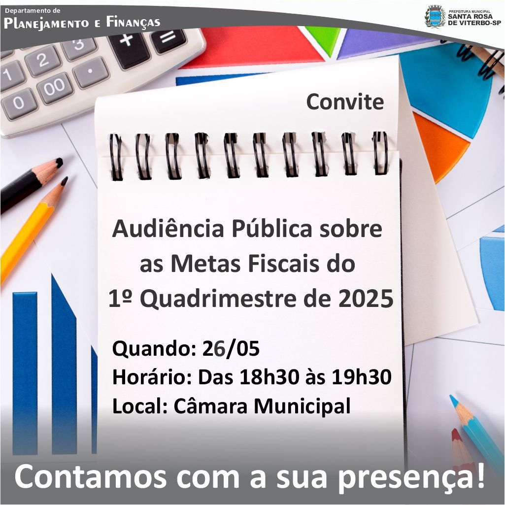 O Departamento de Planejamento e Finanças realizará, no dia 26 de maio, no plenário da Câmara Municipal, das 18h30 às 19h30, a Audiência Pública sobre as Metas Fiscais do 1º Quadrimestre de 2025.