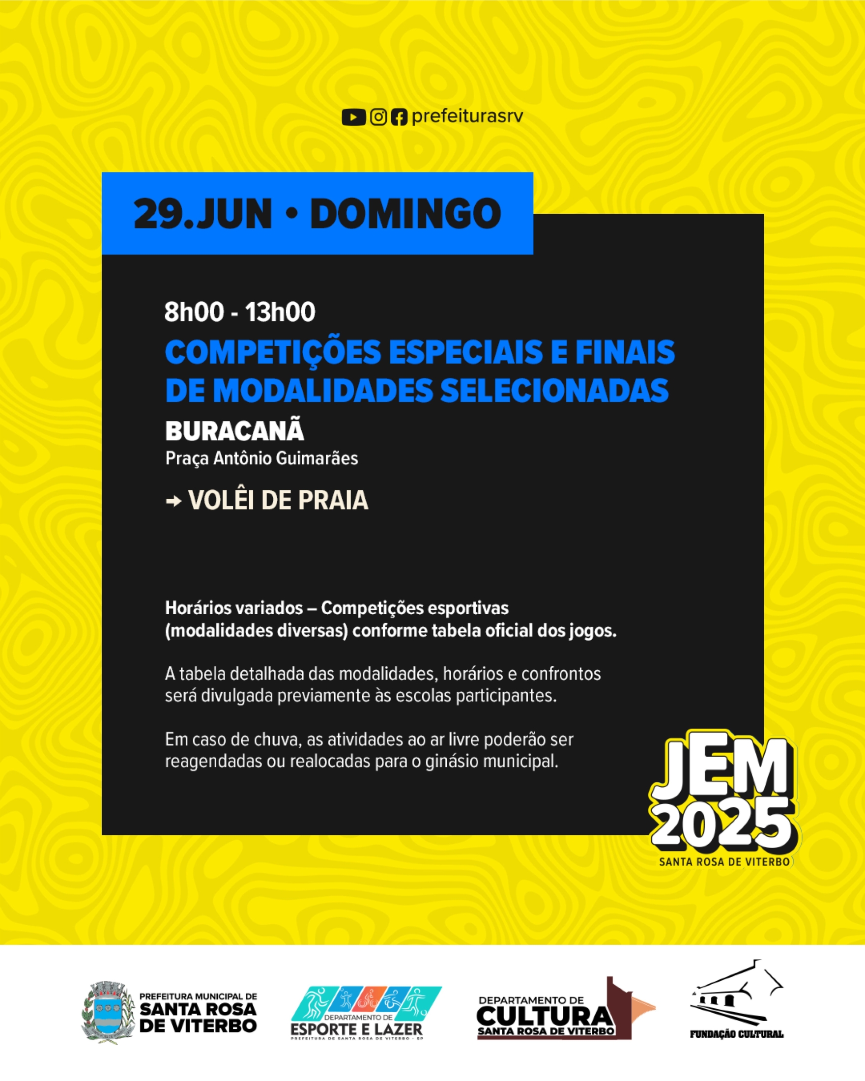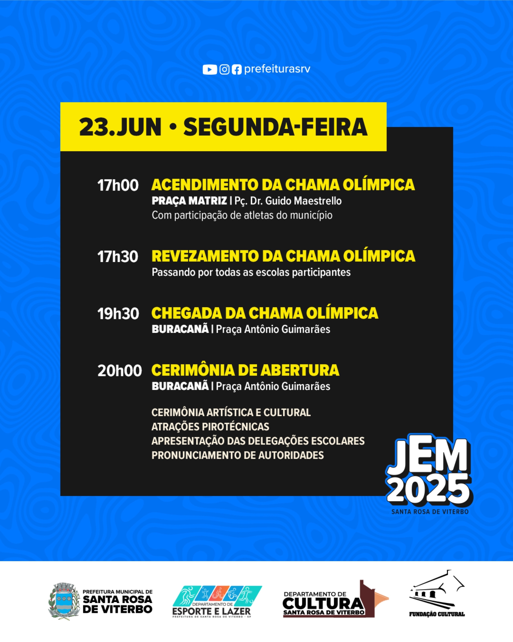 O Departamento de Cultura, Esportes, Turismo e Lazer da Prefeitura de Santa Rosa de Viterbo já está com tudo pronto para o maior evento esportivo de nossa cidade! Confira neste post a programação que ocorrerá de 24 de junho a 1 de julho, tendo a cerimônia de abertura no dia 23 de junho.