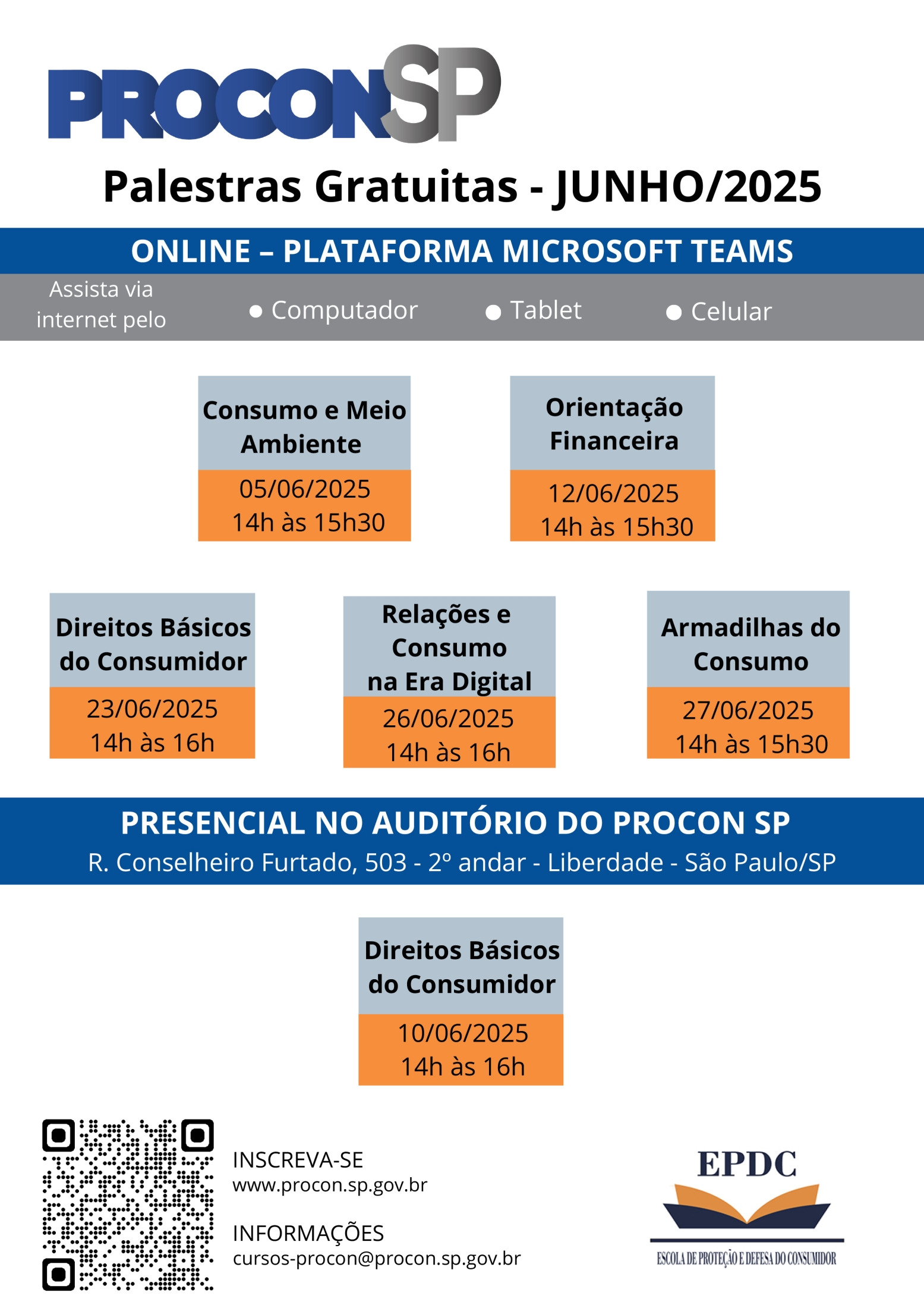 A Fundação Procon-SP está com inscrições abertas para diversas palestras online gratuitas sobre direitos do consumidor, orientação financeira e relações de consumo na era digital. As inscrições devem ser feitas no site do Procon-SP ou através do QRCode na imagem ilustrativa.