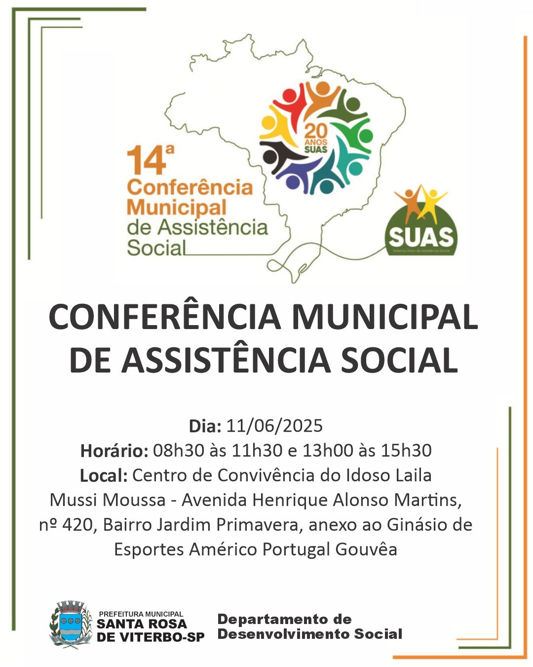 No dia 11 de junho de 2025, das 8h30 às 11h30 e das 13h00 às 15h30, será realizada a 14ª Conferência Municipal de Assistência Social, no Centro de Convivência do Idoso Laila Mussi Moussa, localizado na Avenida Henrique Alonso Martins, nº 420, Bairro Jardim Primavera, anexo ao Ginásio de Esportes Américo Portugal Gouvêa.