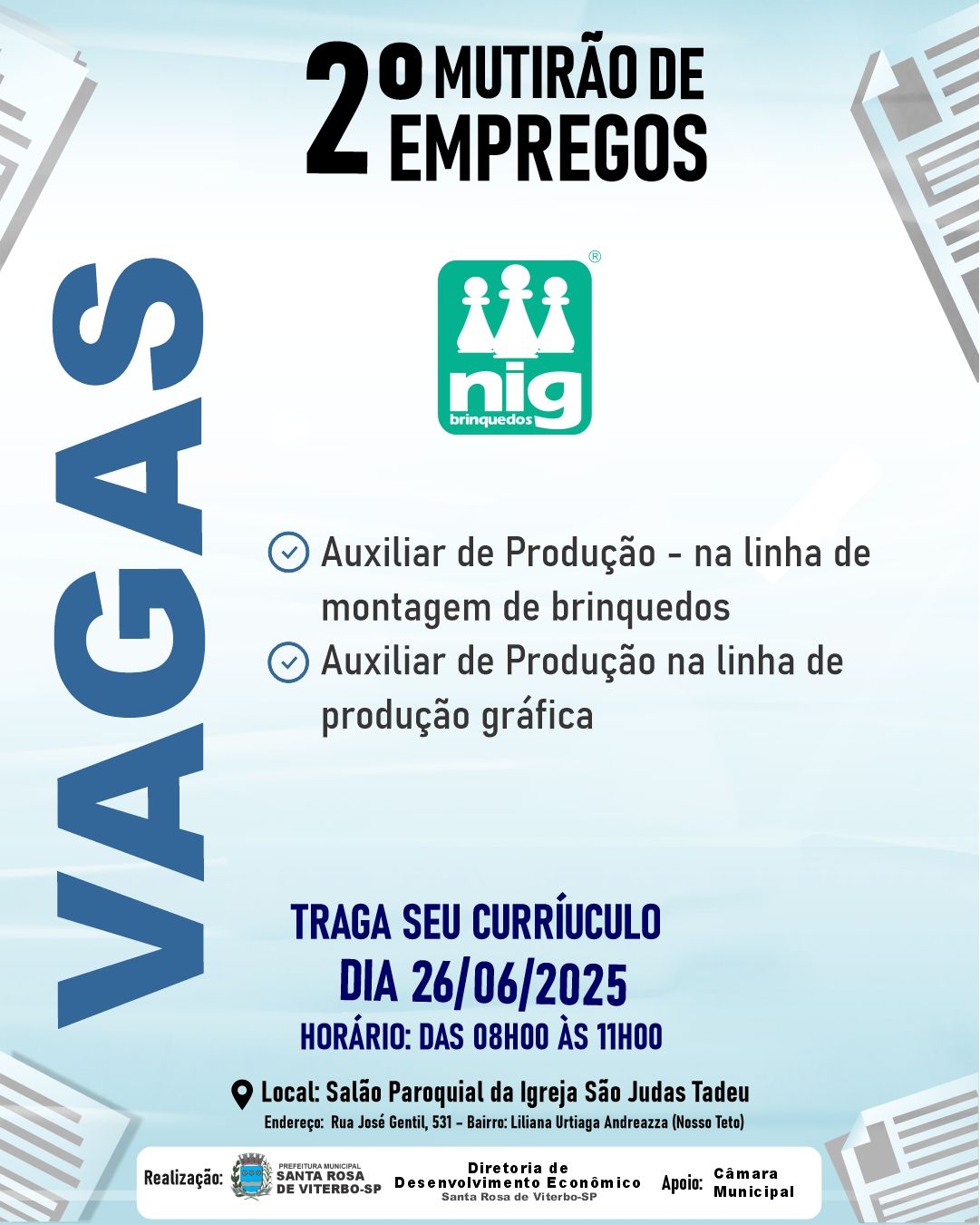 A Prefeitura Municipal, por meio da Diretoria de Desenvolvimento Econômico, apresenta algumas das vagas que estarão disponíveis no 2º Mutirão de Empregos, que será realizado no dia 26 de junho, das 8h às 11h, no Salão Paroquial da Igreja São Judas Tadeu (Rua José Gentil, nº 531, bairro Liliana Urtiaga Andreazza – Nosso Teto).