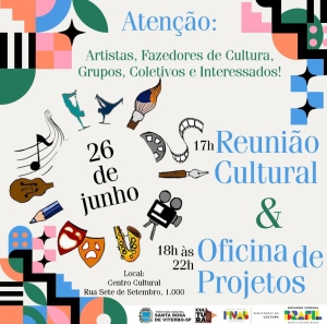 O Departamento de Cultura de Santa Rosa de Viterbo promove, no próximo dia 26 de junho (quinta-feira), uma Reunião Cultural seguida da Oficina de Formatação de Projetos para Editais, no Centro Cultural.