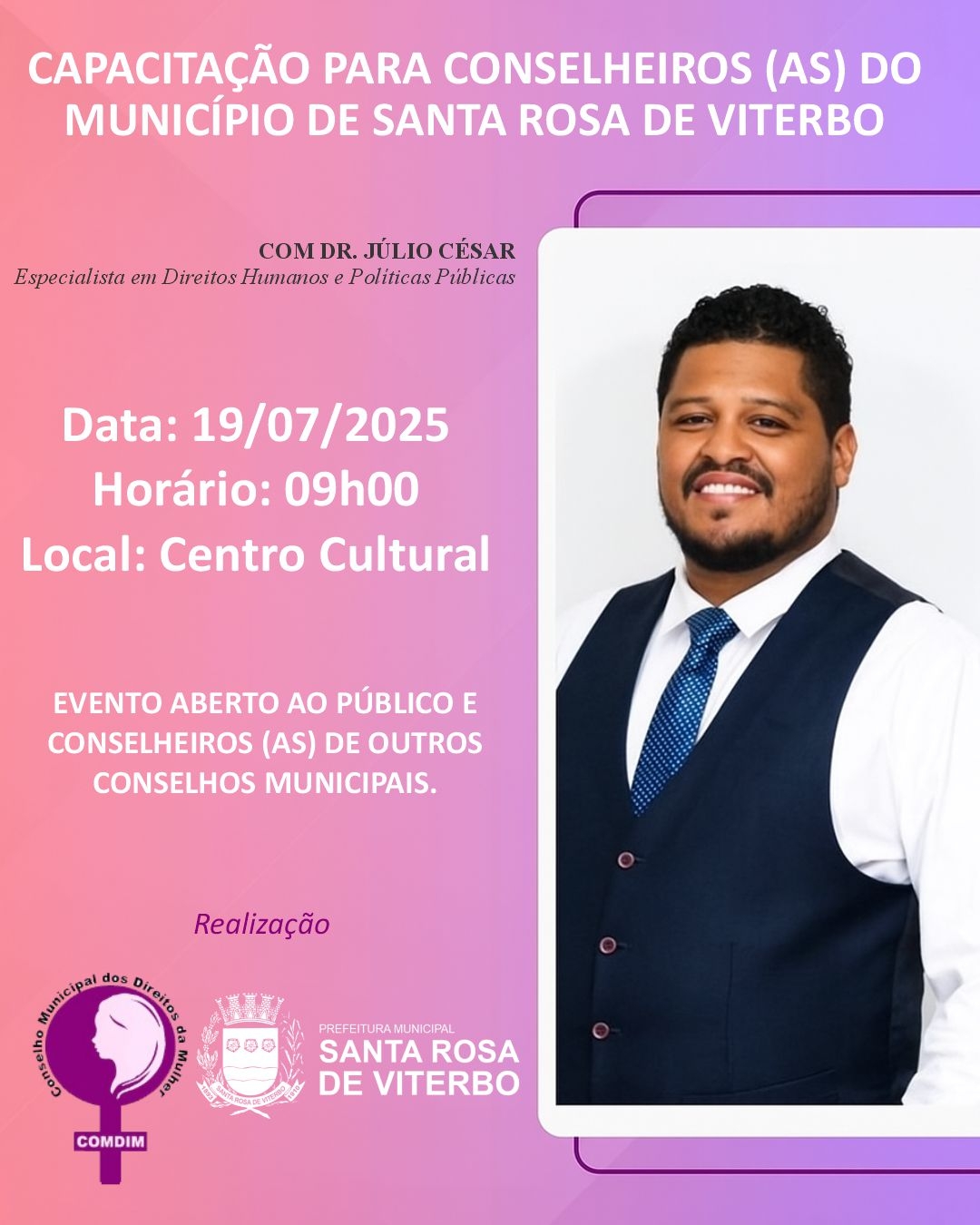No dia 19 de julho de 2025, a cidade de Santa Rosa de Viterbo sediará uma importante capacitação voltada aos conselheiros e conselheiras municipais. O evento será realizado às 09h00 no Centro Cultural e contará com a presença do Dr. Júlio César, especialista em Direitos Humanos e Políticas Públicas.