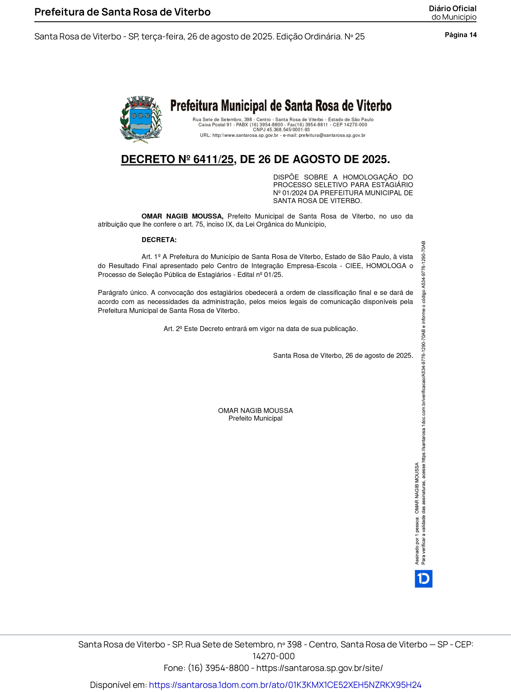 A Prefeitura Municipal, por meio do CIEE (Centro de Integração Empresa Escola) , torna pública a homologação do resultado final do Processo Seletivo de Estagiários nº 01/2025. Após a análise dos recursos interpostos e concluídas todas as etapas previstas no edital, a classificação final dos candidatos foi devidamente aprovada e homologada nesta data através do decreto 6411/25, publicado nesta terça-feira, 26 de agosto.