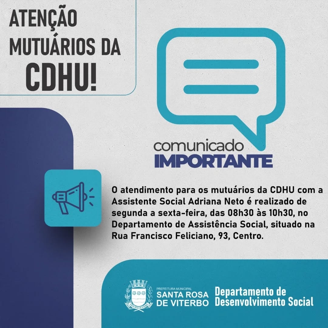 O atendimento para os mutuários da CDHU com a Assistente Social Adriana Neto é realizado de segunda a sexta-feira, das 08h30 às 10h30, no Departamento de Assistência Social, situado na Rua Francisco Feliciano, 93, Centro.
