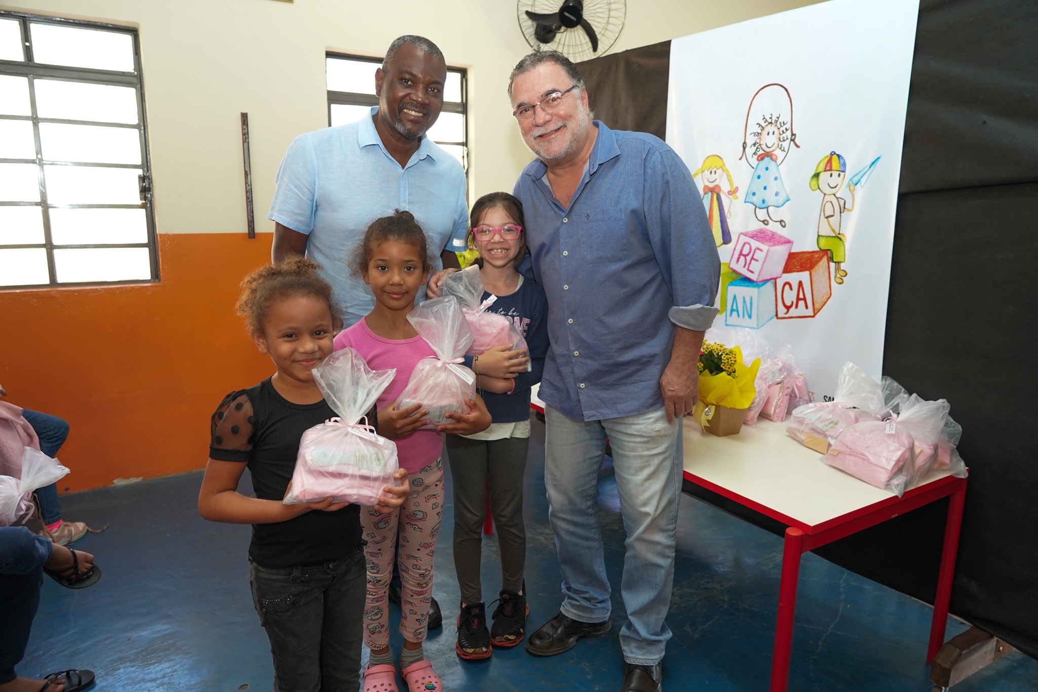 Prefeito Omar Nagib, Vice-Prefeito Paulão Santos e Diretor de Educação Marcos Ferri entregam kits de uniforme para alunos do Recriança