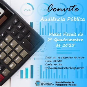 A Prefeitura Municipal de Santa Rosa de Viterbo, por meio da Diretoria Municipal de Planejamento e Finanças, convida a população para participar da audiência pública de apresentação e avaliação do cumprimento das metas fiscais do 2º quadrimestre de 2025.