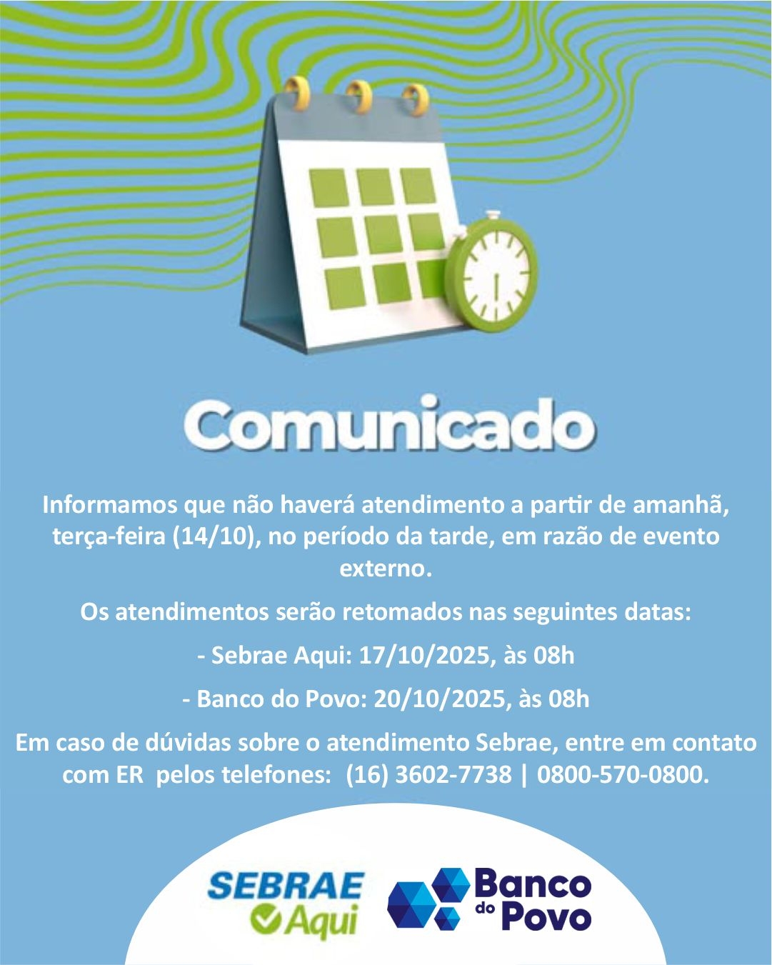 Em caso de dúvidas sobre o atendimento Sebrae, entre em contato com ER pelos telefones:  (16) 3602-7738 | 0800-570-0800