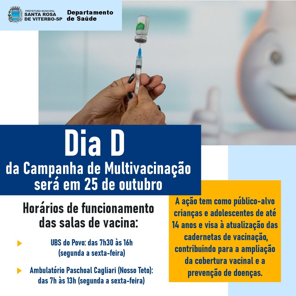 No município, o Dia D da campanha será realizado em 25 de outubro, com atendimento especial nas salas de vacinação. Pais e responsáveis devem comparecer ao posto de referência levando o cartão de vacina e o CPF da criança ou adolescente para conferência do esquema vacinal.