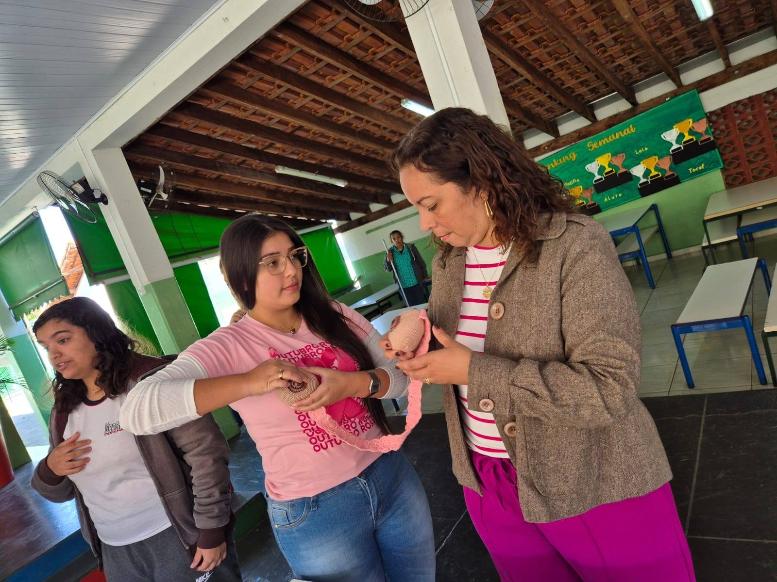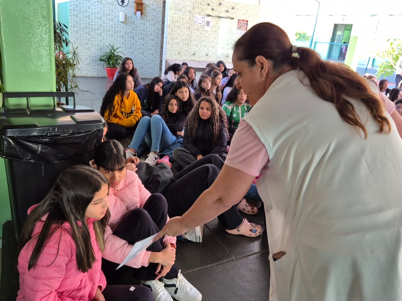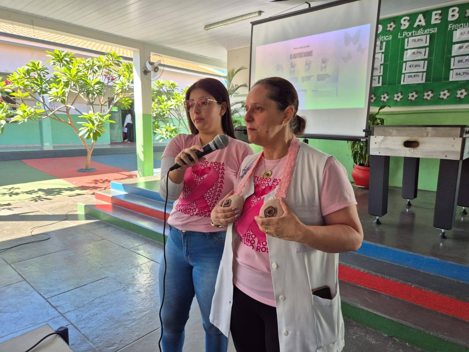No tema Outubro Rosa, as enfermeiras Janaína e Maria Eduarda, da UBS do Povo, abordaram a importância da prevenção e do diagnóstico precoce do câncer de mama na escola Vergínio Melloni.
