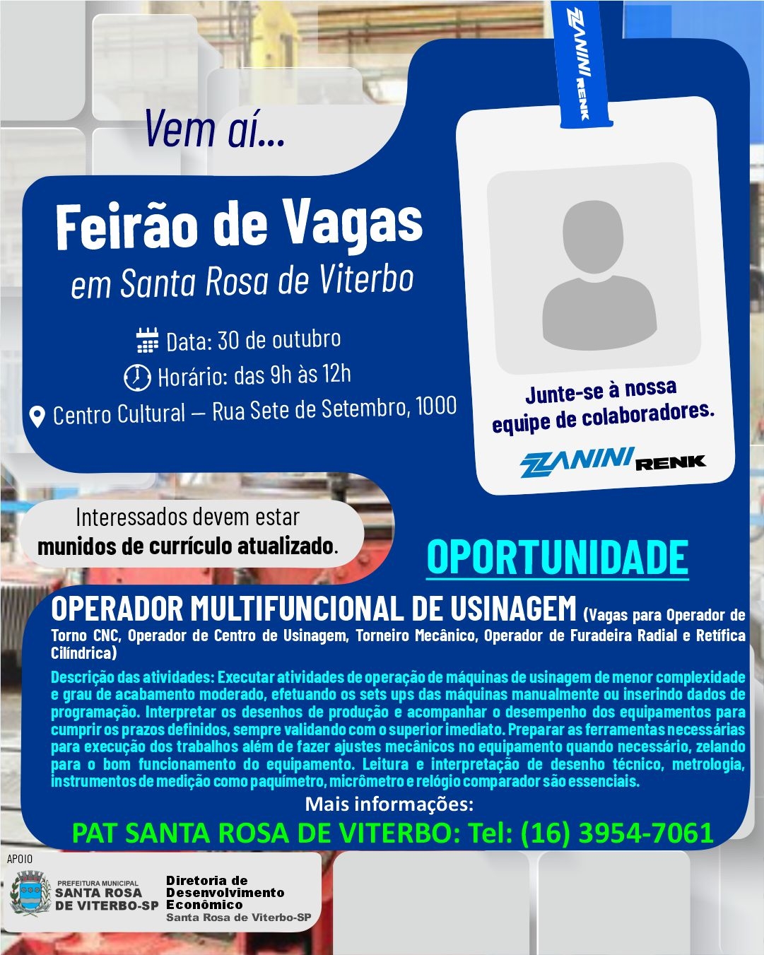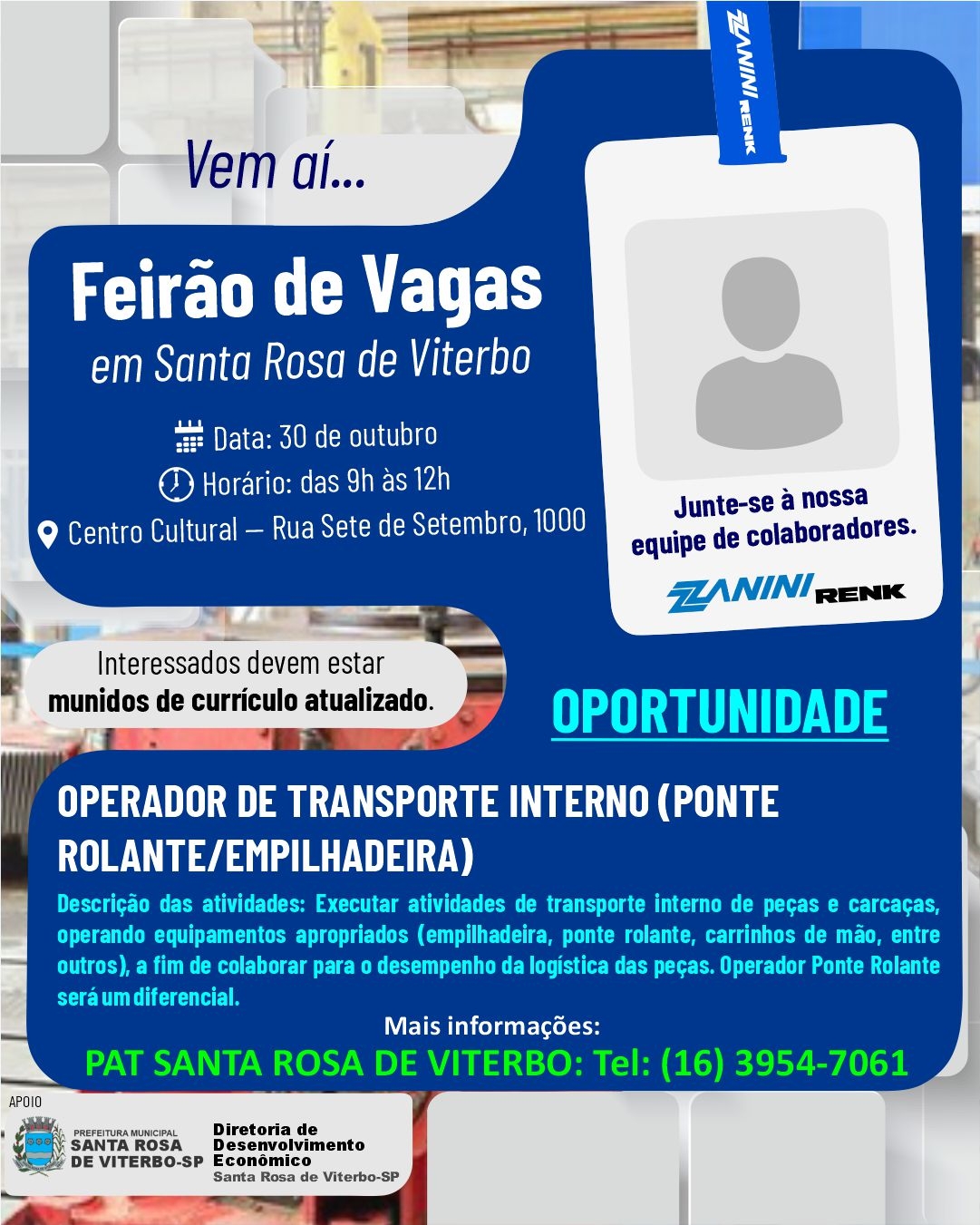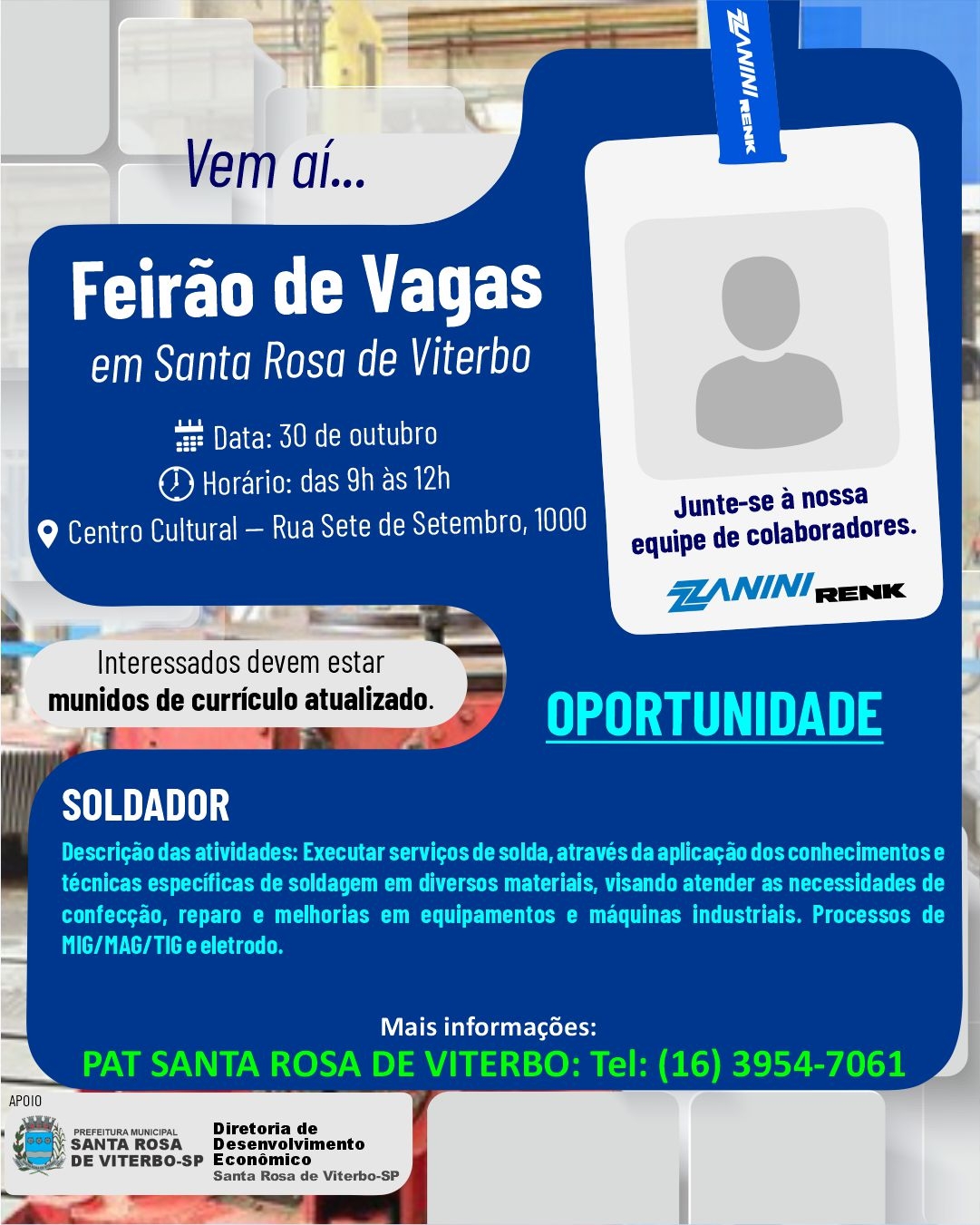 Com o apoio da Prefeitura Municipal, a empresa Zanini Renk, de Cravinhos, realiza amanhã (30 de outubro) um Feirão de Vagas em Santa Rosa de Viterbo. O evento acontece das 9h às 12h, no Centro Cultural (Rua Sete de Setembro, 1000).