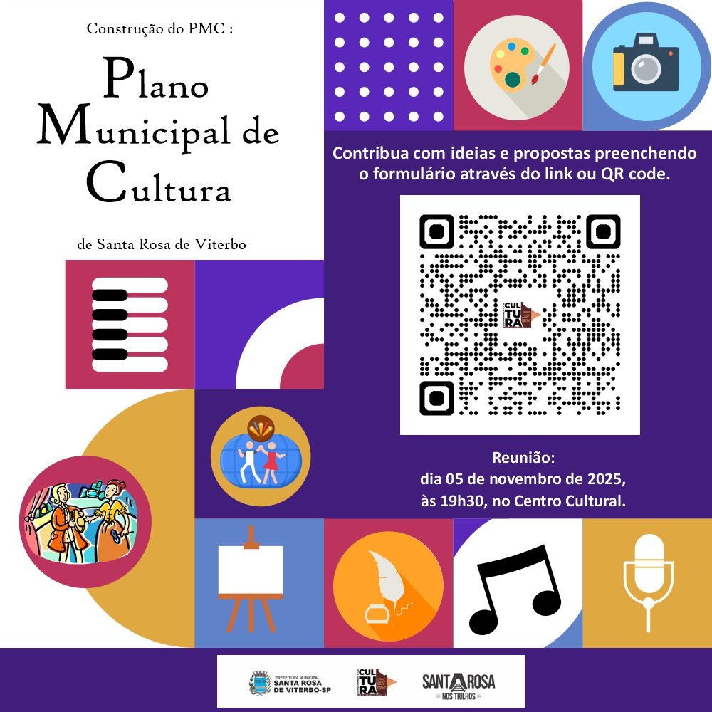 O Departamento de Cultura convida a todos para a reunião de Construção do Plano Municipal de Cultura, amanhã, dia 05 de novembro de 2025, às 19h30, no Centro Cultural.