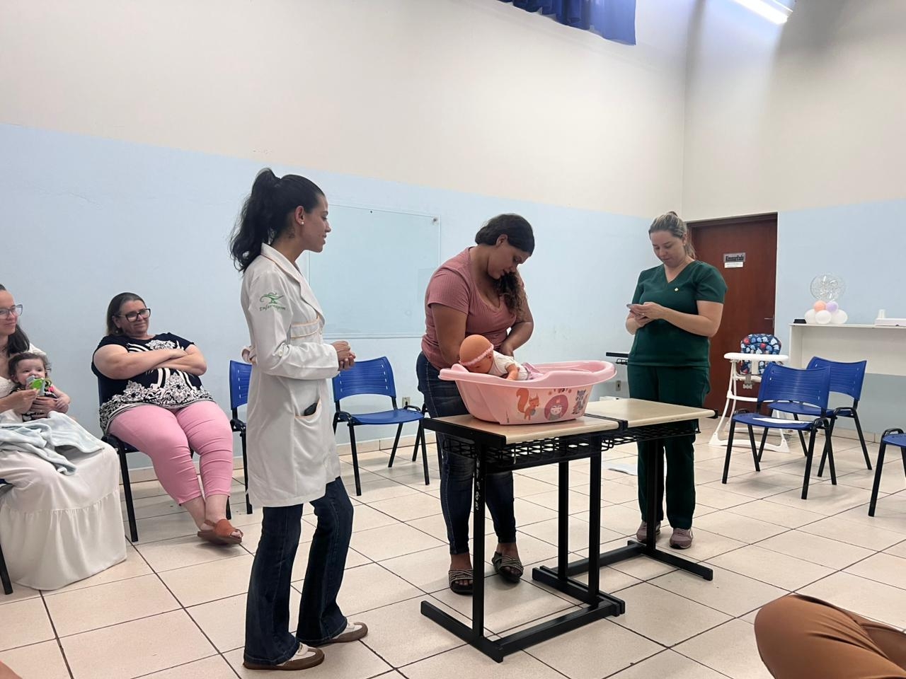 Além disso, as enfermeiras Adriana, Natália, Rinara e Adriele conduziram uma oficina prática de cuidados com o recém-nascido, abordando desde o banho e higiene até recomendações essenciais para a segurança e o bem-estar do bebê.