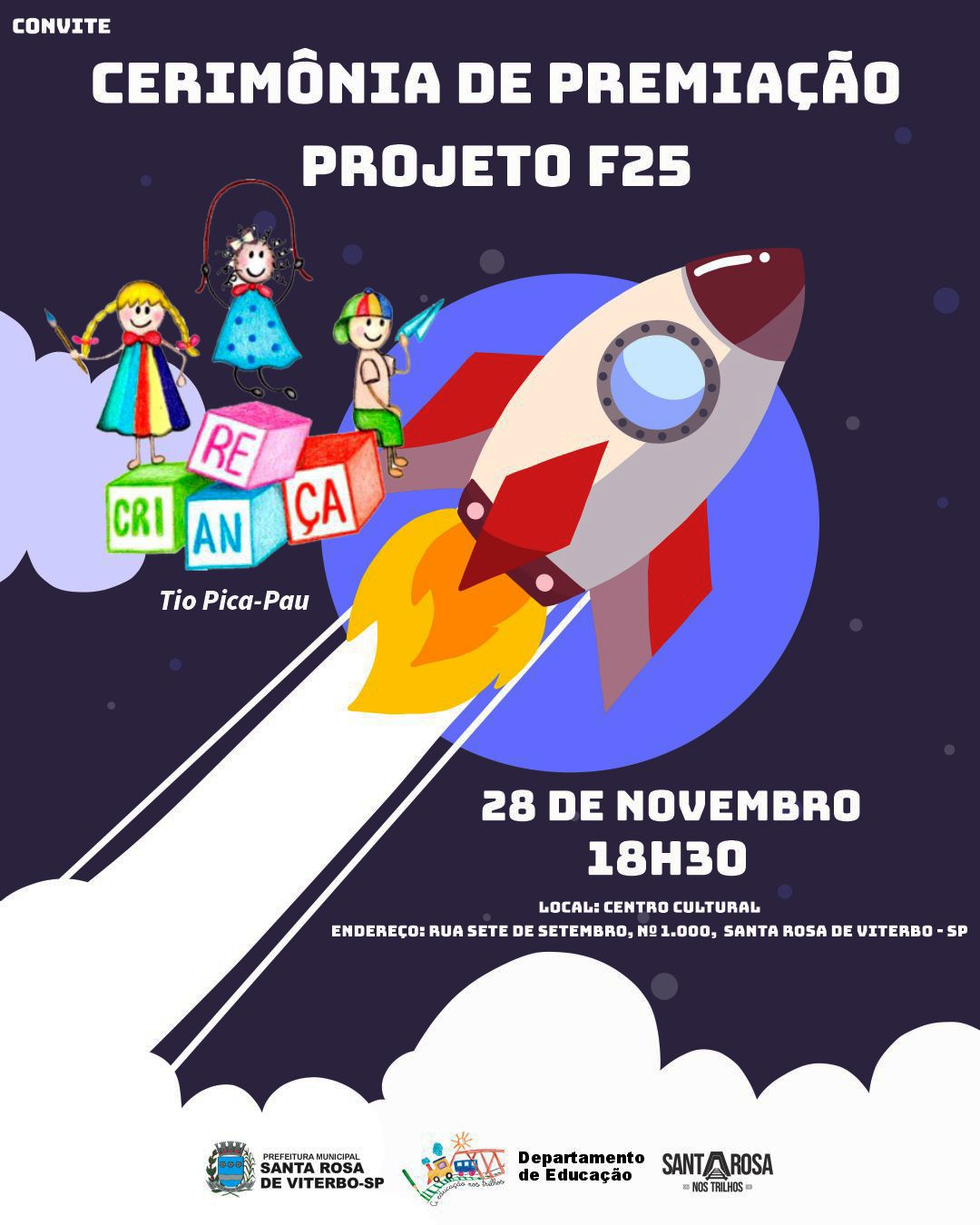 A cerimônia de premiação dos alunos do Recriança Tio Pica-Pau, participantes do Projeto F25, será realizada nesta sexta-feira, 28 de novembro, às 18h30, no Centro Cultural. O evento marca o encerramento das atividades desenvolvidas ao longo do projeto, que envolveu os estudantes em todas as etapas de construção, estudo e lançamento de foguetes educativos.