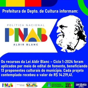 A Prefeitura de Santa Rosa de Viterbo, por meio do Departamento de Cultura, informa que os recursos da Lei Aldir Blanc – Ciclo 1-2024 foram aplicados por meio de edital de fomento, beneficiando 13 proponentes culturais do município.