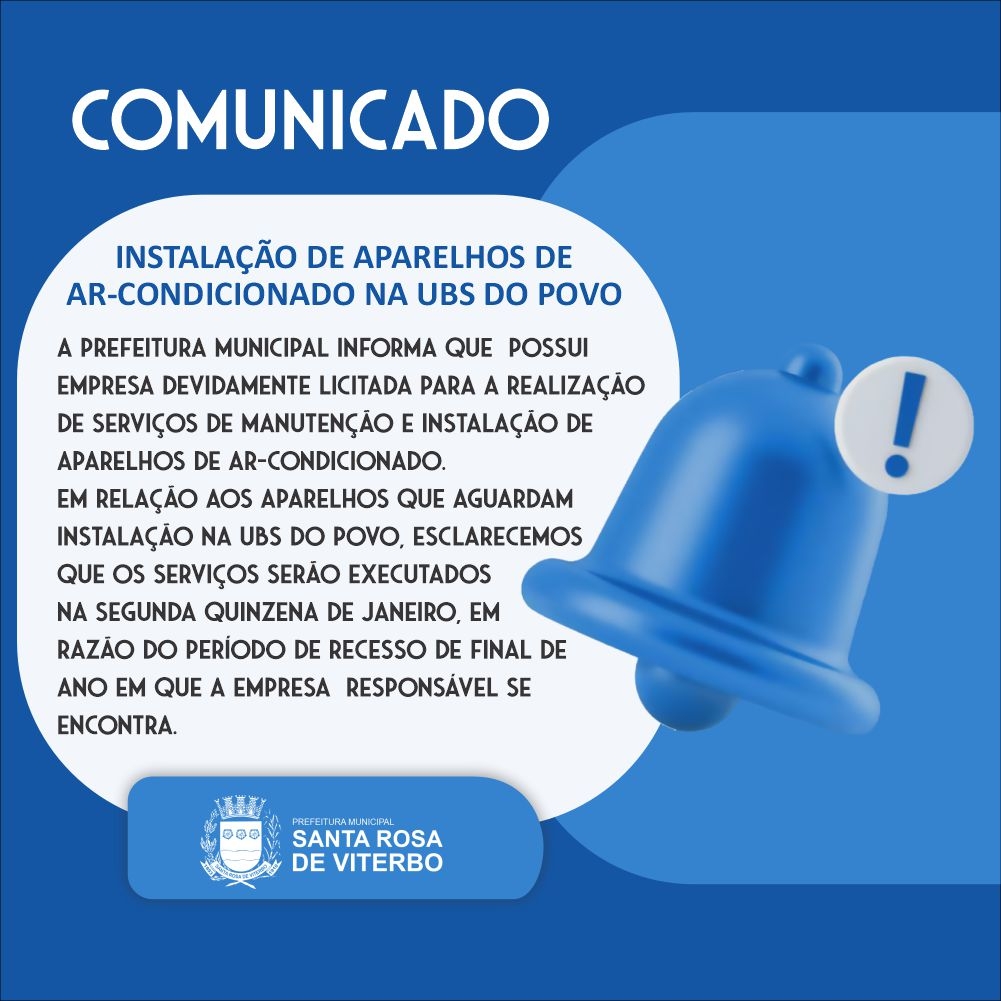 Em relação aos aparelhos que aguardam instalação na UBS do Povo, esclarecemos que os serviços serão executados na segunda quinzena de janeiro, em razão do período de recesso de final de ano em que a empresa responsável se encontra.