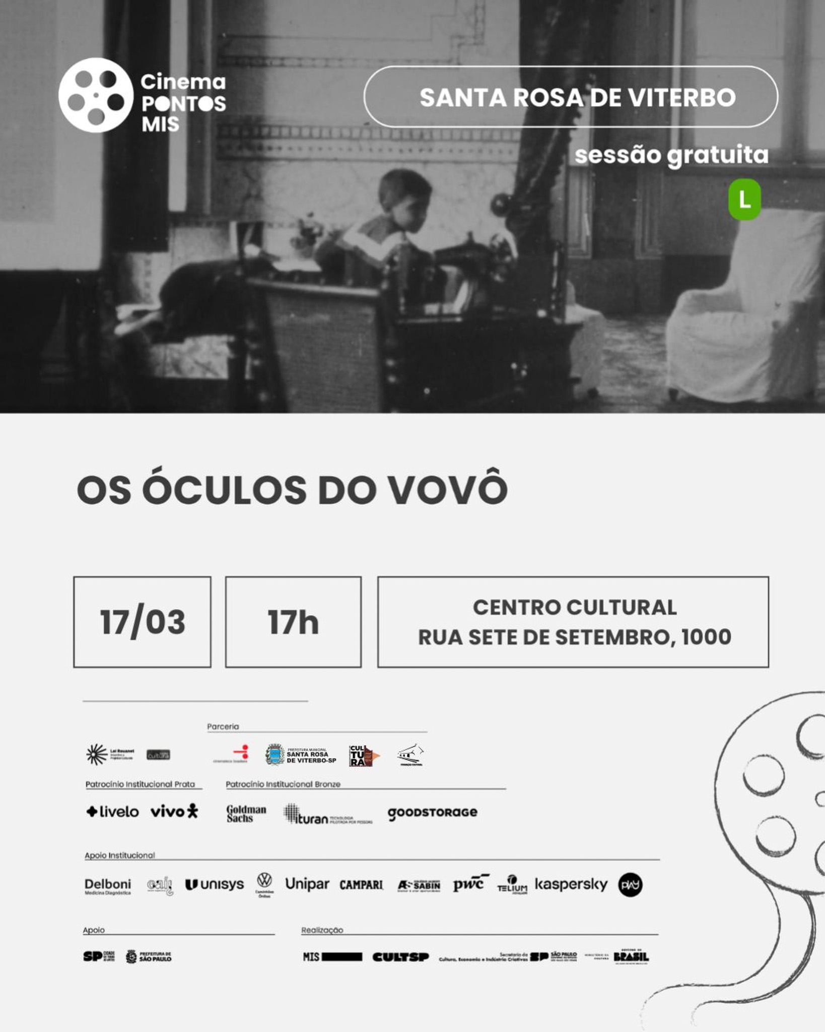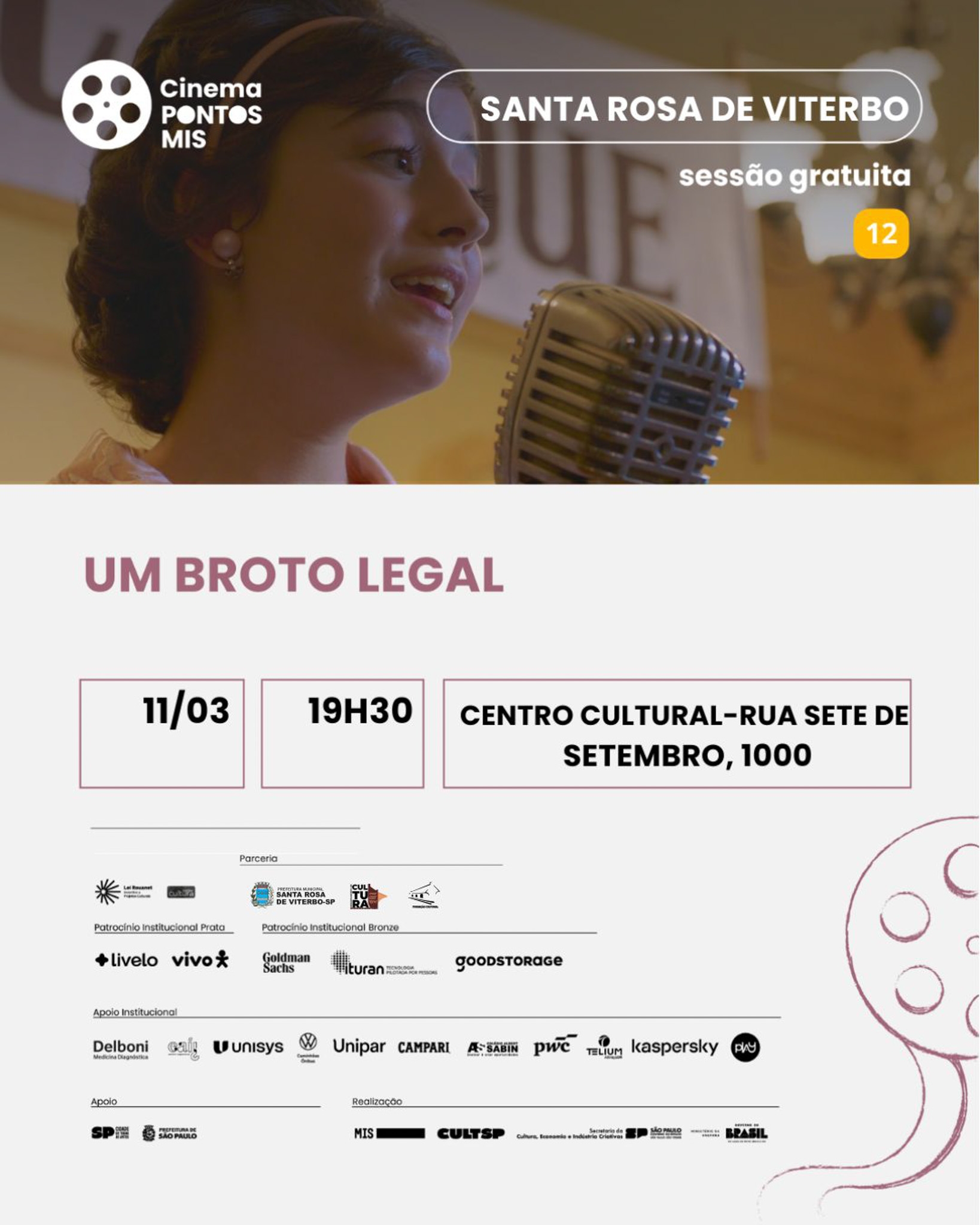 O Pontos MIS, a Fundação Cultural e o Departamento de Cultura apresentam a programação de filmes que serão exibidos no Centro Cultural ao longo do mês de março, em Santa Rosa de Viterbo.