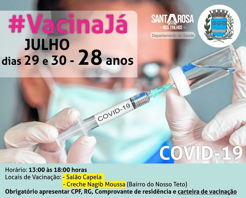 Santa Rosa de Viterbo avança mais uma vez na campanha de vacinação contra a Covid-19 e imuniza nesta quinta-feira (29) e sexta-feira (30), o público com 28 anos. As pessoas dessa faixa etária podem comparecer ao Salão Capela ou a creche Nagib Moussa, das 13h às 18h, com o CPF, RG, comprovante de residência e a carteira de vacinação para receber a sua dose. É obrigatório o uso de máscara.