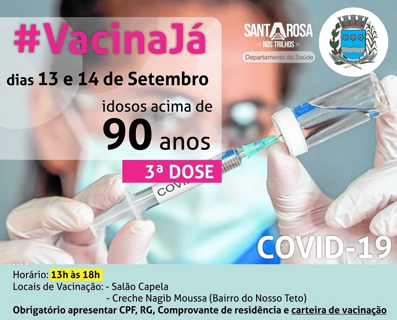 O programa de vacinação no município de Santa Rosa de Viterbo começará a imunizar, com a 3ª dose, idosos acima dos 90 anos de idade e que tenham recebido a 2ª dose há, pelo menos, seis meses.