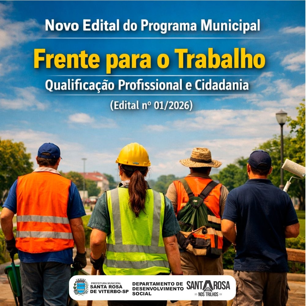 A Prefeitura de Santa Rosa de Viterbo publicou o Edital nº 01/2026, que abre inscrições para o Programa Municipal “Frente para o Trabalho – Qualificação Profissional e Cidadania”, por meio do Departamento Municipal de Desenvolvimento Social. A iniciativa tem como objetivo promover qualificação profissional, inclusão social e garantia de renda, por meio de trabalho temporário remunerado.