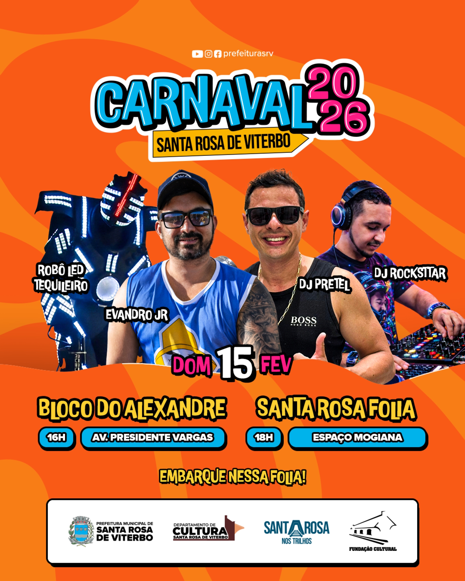 Realização: Prefeitura Municipal de Santa Rosa de Viterbo, por meio do Departamento de Cultura e da Fundação Cultural, com apoio da Câmara Municipal.