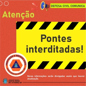 A Defesa Civil de Santa Rosa de Viterbo informa que, em razão do grande volume de chuva registrado na tarde deste sábado, duas pontes encontram-se interditadas no município: