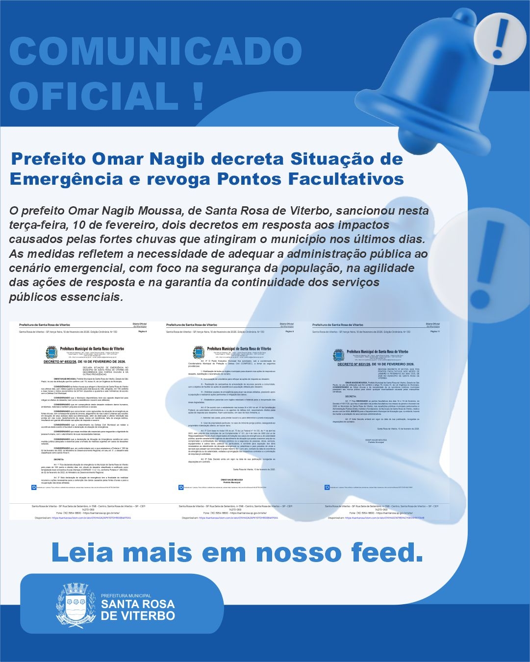 O prefeito Omar Nagib Moussa, de Santa Rosa de Viterbo, sancionou nesta terça-feira, 10 de fevereiro, dois decretos em resposta aos impactos causados pelas fortes chuvas que atingiram o município nos últimos dias. As medidas refletem a necessidade de adequar a administração pública ao cenário emergencial, com foco na segurança da população, na agilidade das ações de resposta e na garantia da continuidade dos serviços públicos essenciais.