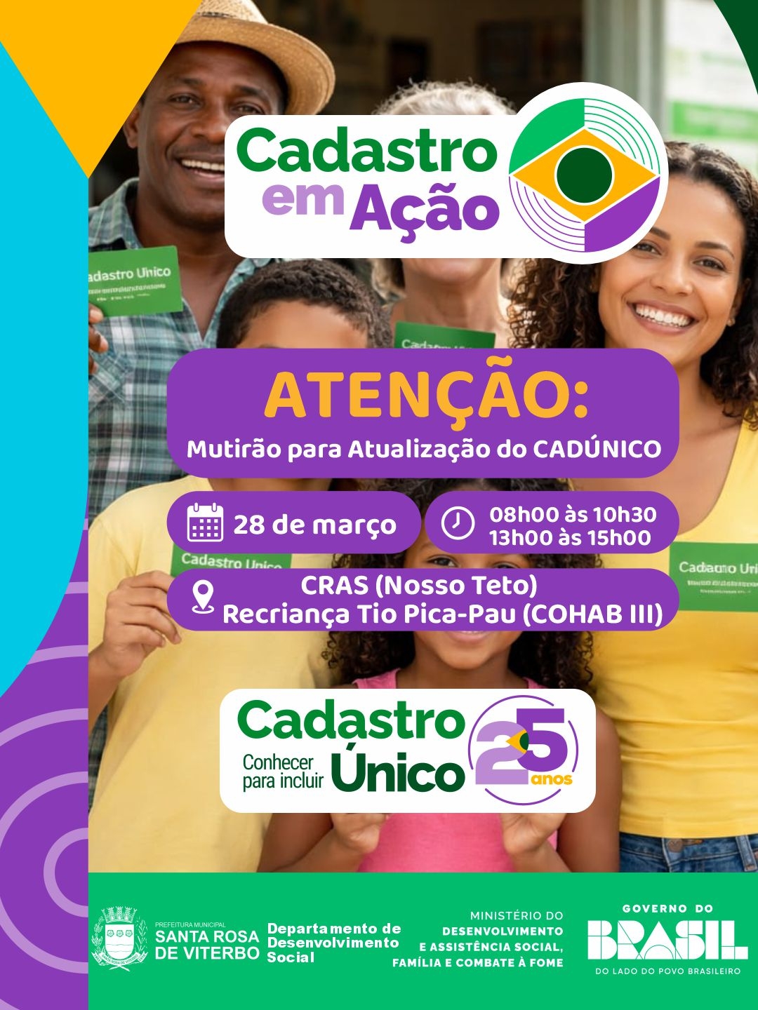 O Departamento de Desenvolvimento Social da Prefeitura de Santa Rosa de Viterbo realizará, neste sábado, 28 de março, um mutirão de atualização cadastral para as famílias que estão com o Cadastro Único desatualizado há mais de 2 anos.