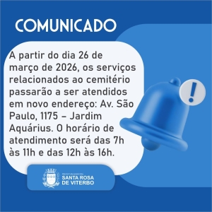 A partir do dia 26 de março de 2026, os serviços relacionados ao cemitério passarão a ser atendidos em novo endereço: Av. São Paulo, 1175 – Jardim Aquárius.