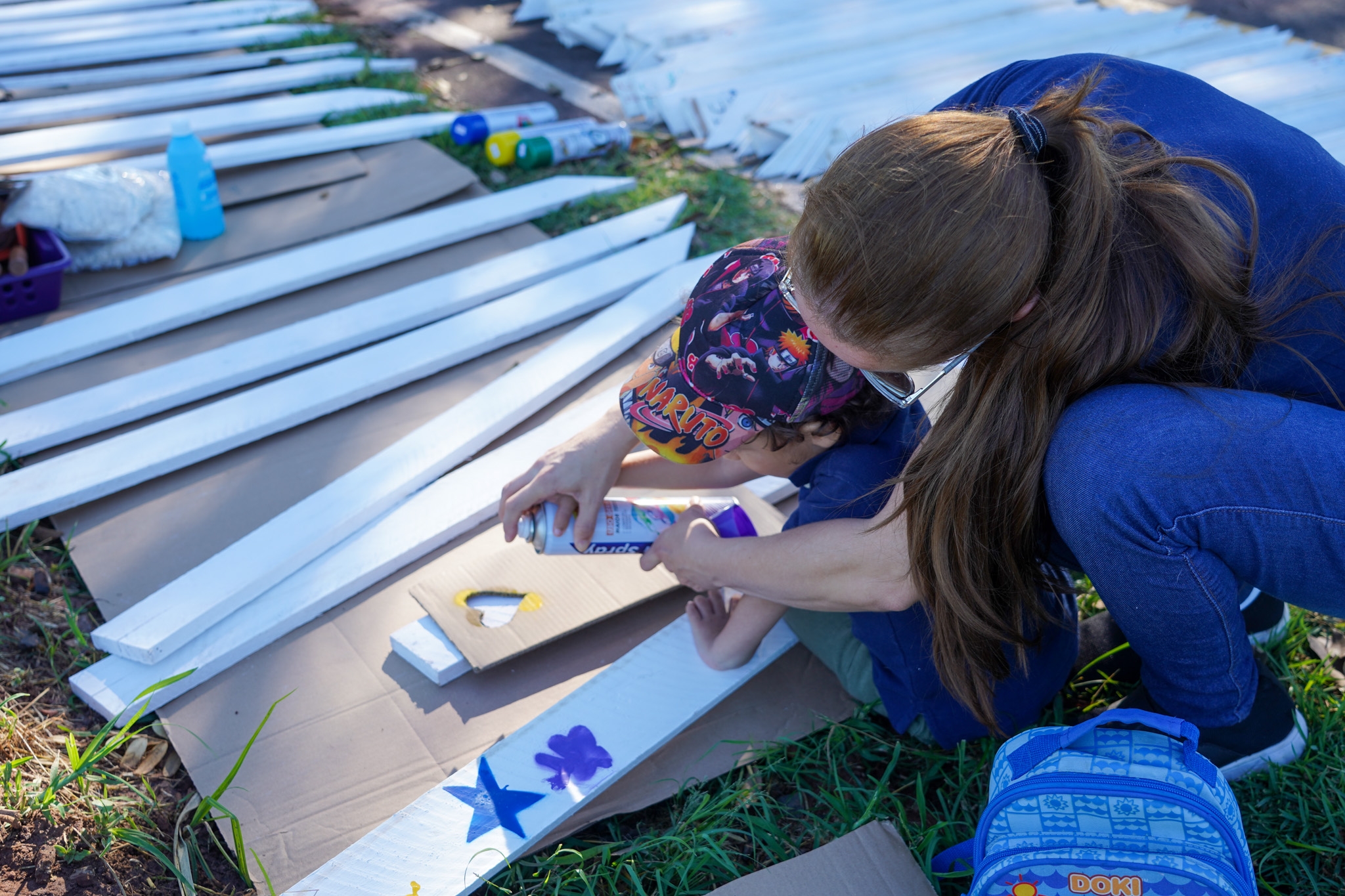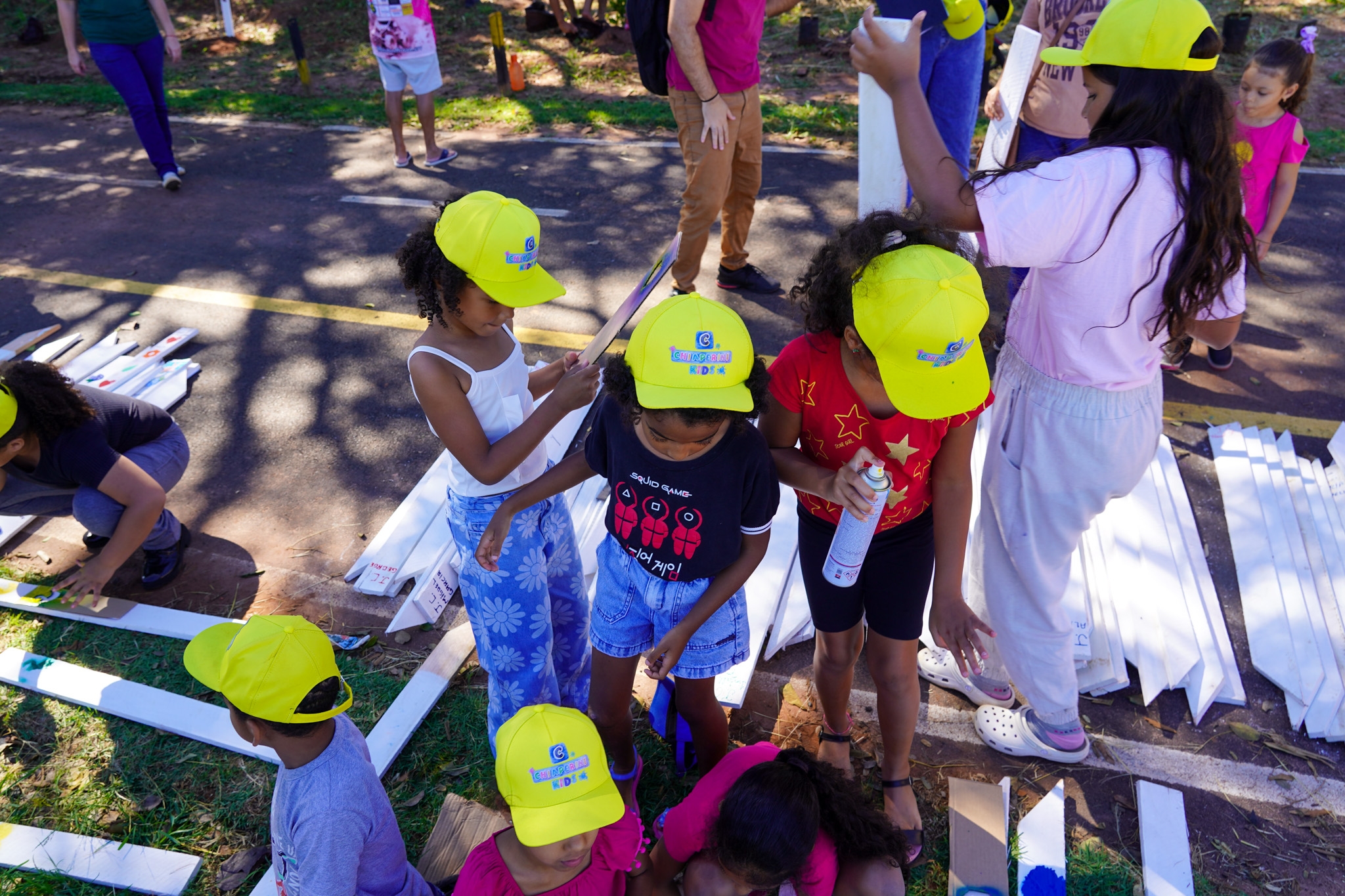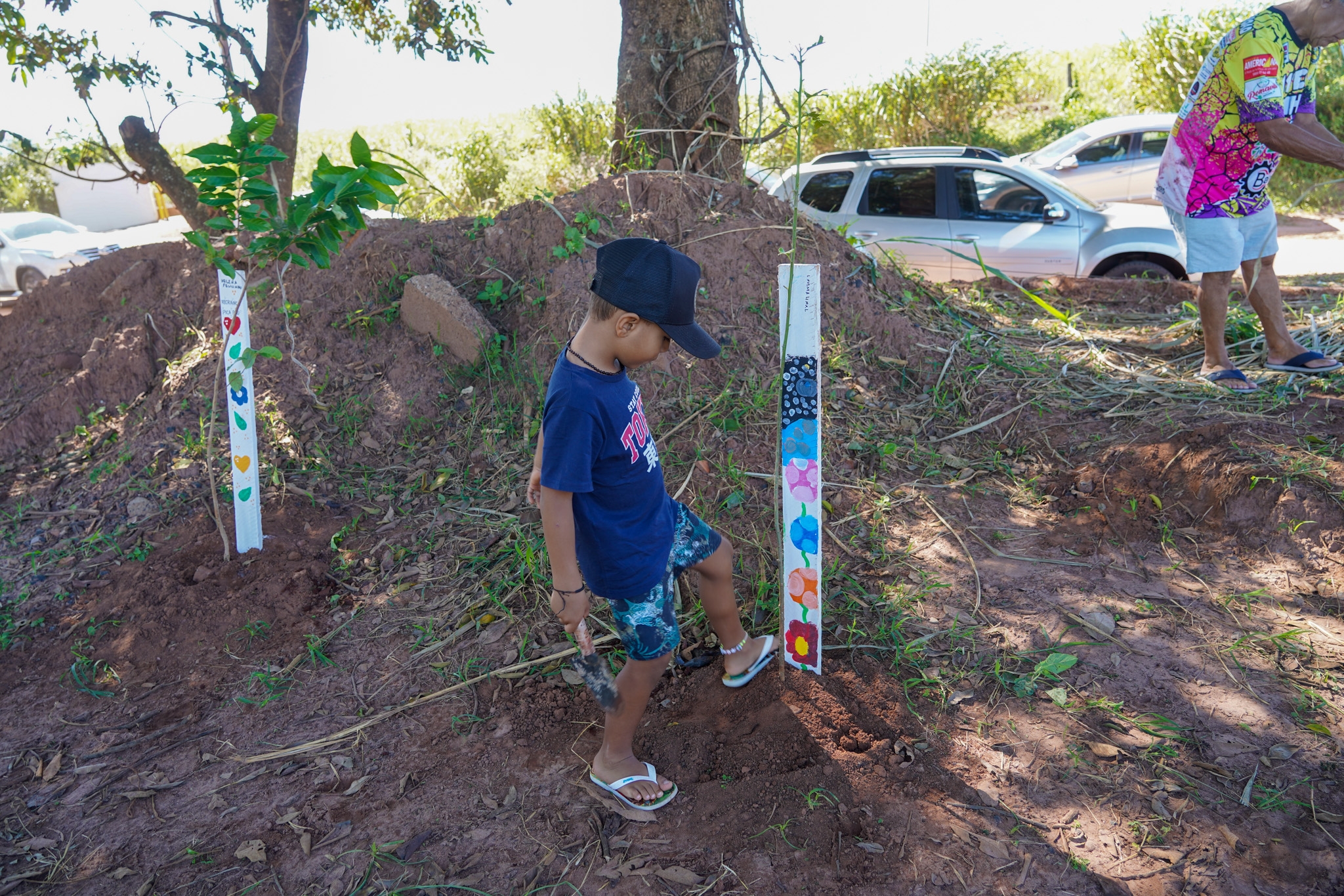 Sob um clima de entusiasmo e cuidado, crianças e adultos compartilharam um gesto simples, mas carregado de significado: plantar o futuro. As crianças foram protagonistas da atividade, participando diretamente do plantio e deixando sua marca no local ao fincarem estacas com seus nomes e desenhos feitos por elas mesmas ao lado de cada muda, criando um vínculo afetivo com as árvores e com o espaço.